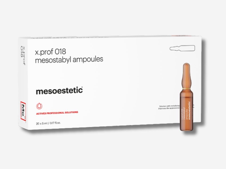 Las ampollas x.prof 018 Mesostabyl son un tratamiento mesoterápico concentrado que combina activos potentes para revitalizar y estabilizar la piel dañada o envejecida.